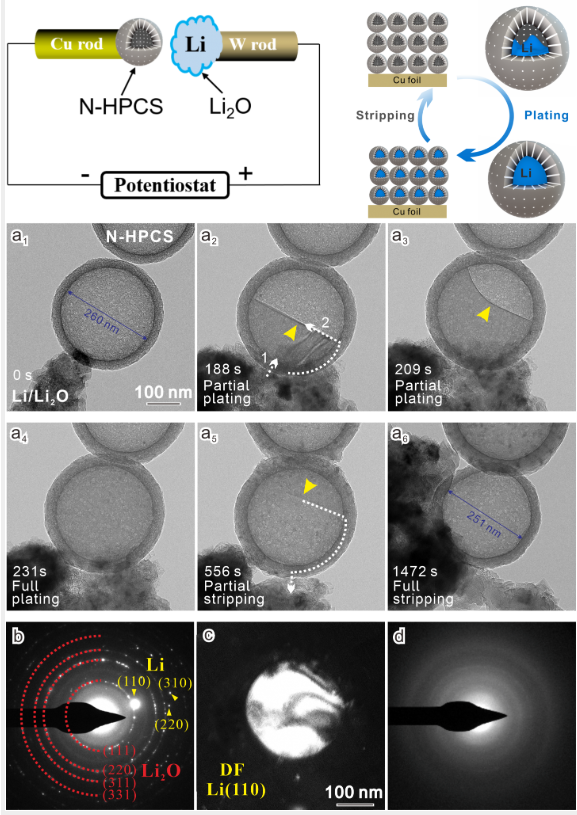 该工作所制备的N-HPCS具有两个主要特征:(1)多孔掺氮的亲锂碳壳层,从而有利于锂离子的快速传输并充满碳壳层;(2)碳球内表面有一层致密的富氮层,从而有效引导锂在碳球内壁(而非外壁)实现优先成核。锂金属在碳壳层内壁成核后,以单晶的形式生长并填满整个碳球空腔;改变偏压后,锂金属可以几乎完全可逆脱出(包括碳壳层内锂离子)。如此高度可逆锂金属的封装可以稳定反复的进行,作者展示了在单个碳球内部反复沉积/溶出50次以上。此外,多个碳球原位实验显示,锂金属可以经由球间离子传输逐渐填充满所有碳球内腔,从而实现锂的均匀沉积。如此可有效封装大量的锂金属,避免锂枝晶的生长。作者还合成了另外两种无氮(HPCS)或无孔(N-HCS)的碳球进行对比实验,结果只有N-HPCS碳球才能实现锂金属在球内空间的沉积与溶出,说明了合理的碳球结构设计对于实现稳定纳米封装的必要性。另外,三种碳球负极的电化学测试也证明了锂金属的纳米封装对于引导锂均匀沉积、抑制锂枝晶生长及实现高循环稳定性的重要作用。