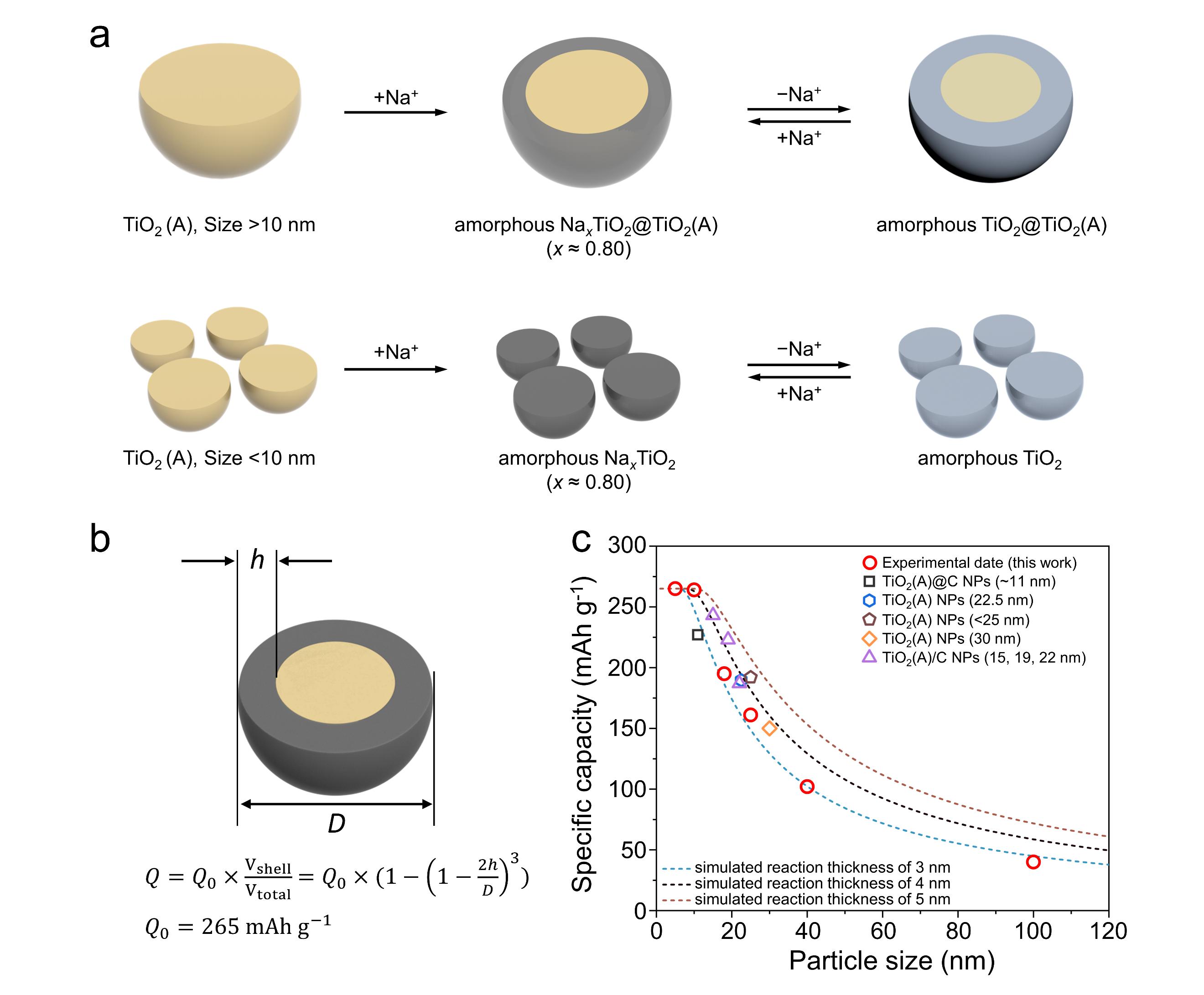 钠离子电池因较低的成本和丰富的资源,有望应用于大规模储能,因而备受研究者们关注。关于钠离子电池材料的储钠机理需要深入研究,此前关于二氧化钛储钠机制主要存在两种相矛盾的观点:一种认为二氧化钛储钠是嵌入型反应,另一种认为二氧化钛储钠过程会伴随着无定形化转变。此外,二氧化钛储钠性能的构效关系和其赝电容响应来源需要进一步揭示,为实际的钠离子电池材料设计提供科学依据。
